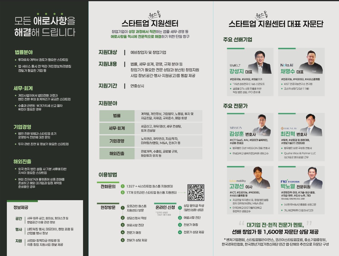 지원내용: 법률, 세무·회계, 경영, 규제 분야 등 창업가가 필요한 전문 상담과 분산된 창업지원 사업 정보를 통합 제공